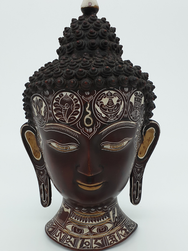 Handmade, hand etched clay Buddha mask with Buddhist auspicious symbols. Incredible craftsmanship direct from Nepalese artisans.