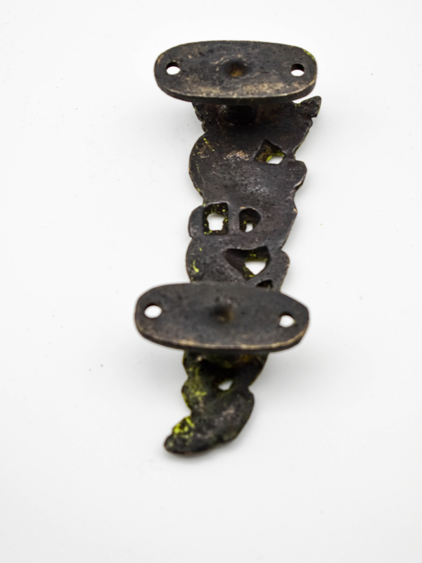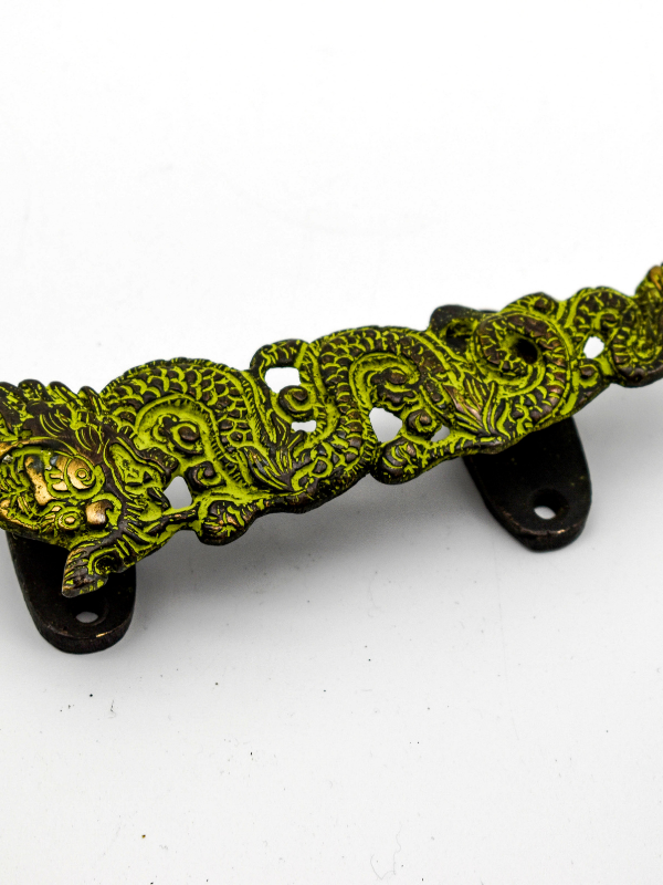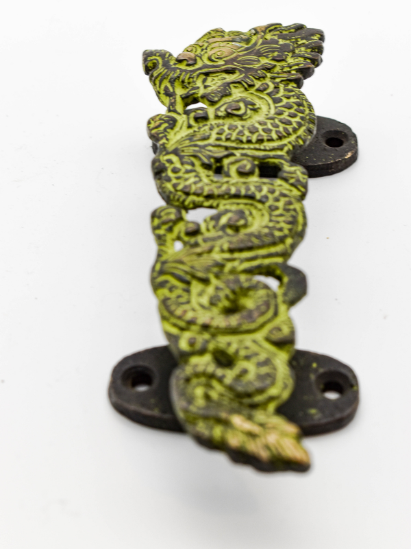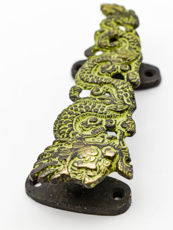 This dragon door handle looks incredible and is certainly a unique addition to your home! It's cast bronze with a beautiful green patina. This gives a lovely antique, temple feel to the handle. The patina also helps highlight the detail on the casting such as the scales and face. The handle depicts a curled dragon twined back and forward to make up the grip. The face and scales are also etched into the metal and add great texture. To the back there are two attached plates with holes drilled to fix the door handle on, meaning they can be attached to any doors or drawers. In the hand they feel heavy and sturdy and also have a great grip. The dragon is concave towards the back.