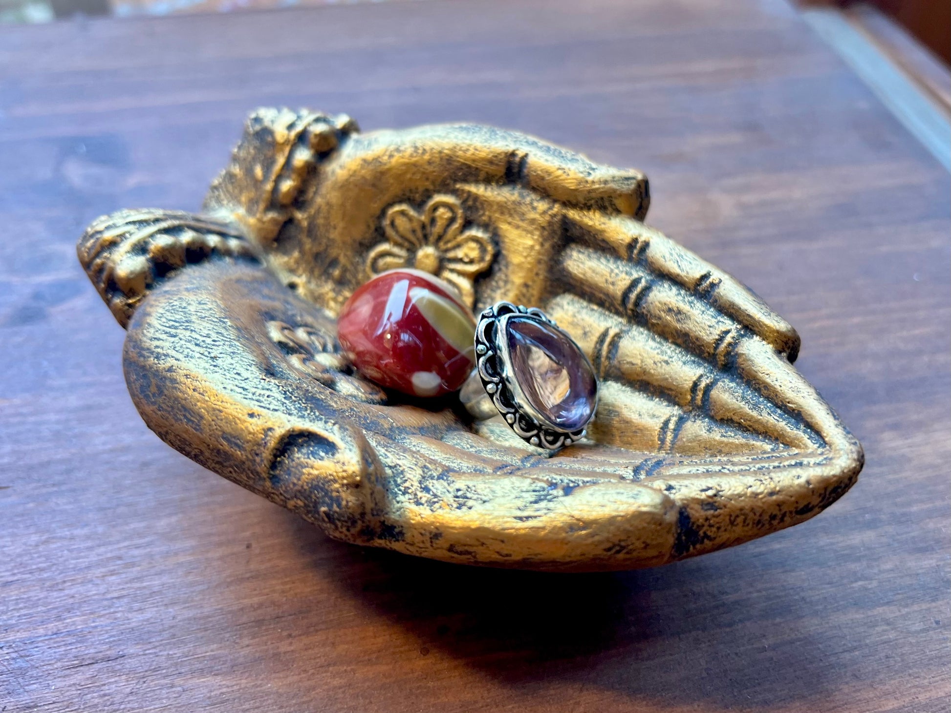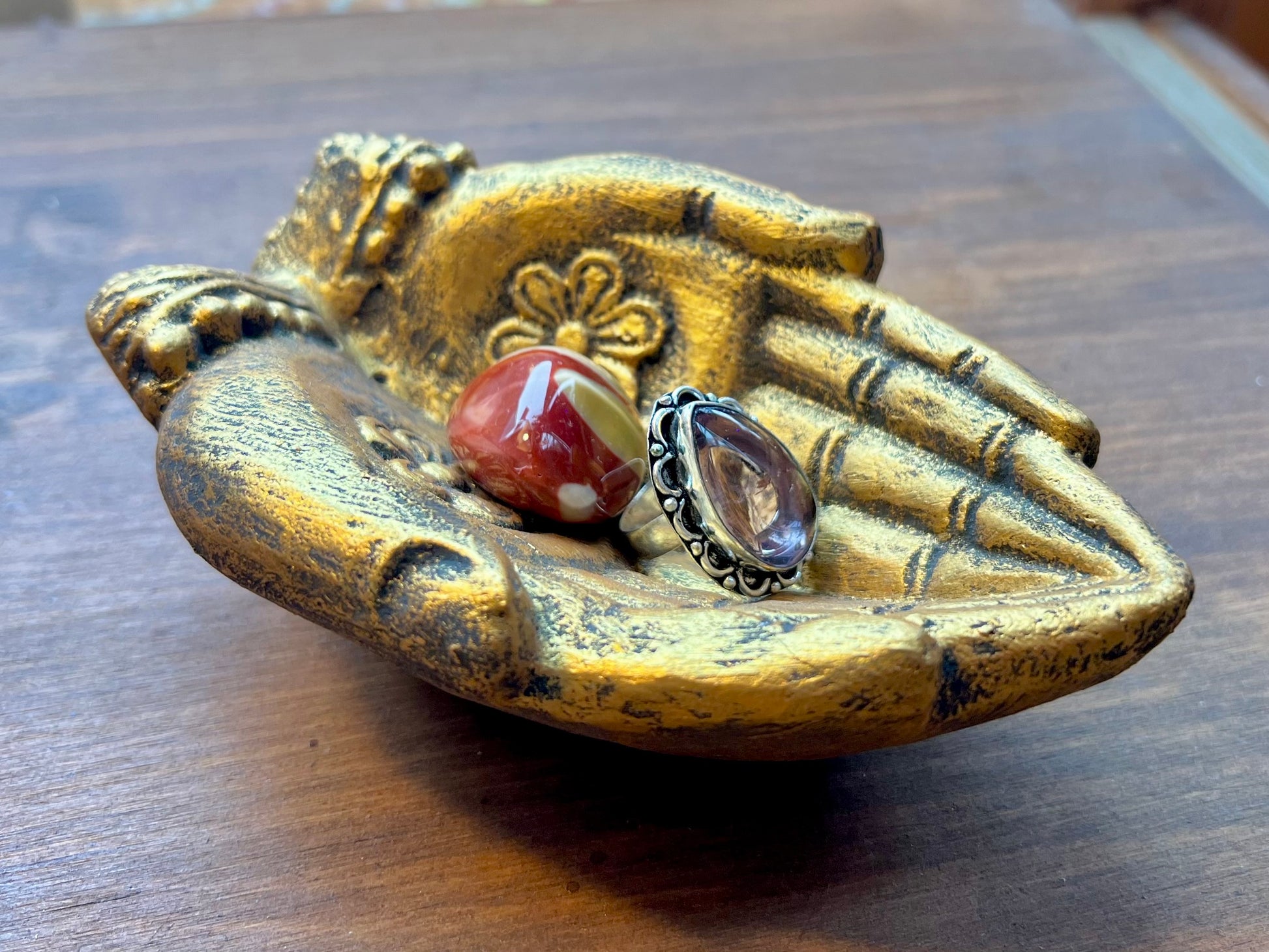 Painted in a shimmering gold, the dish features the graceful form of two hands delicately cupped in prayer, creating a serene vessel for treasured trinkets, cherished rings, and radiant crystals. Each curve and contour is meticulously sculpted, infusing the dish with a sense of tranquillity and reverence.