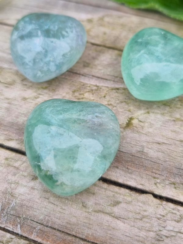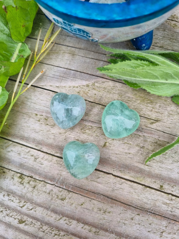 Fluorite was known in medieval times as the 'genius stone' for its ability to aid creative thinking and problem solving. It also aided with ironsmithing and glassmaking, improving the consistency of the molten metal and glass. You can get all kinds of colours of fluorite, and within these hearts are lovely sea and sky tones. Looking into them is like looking at the ocean waves (check the close up pic!).