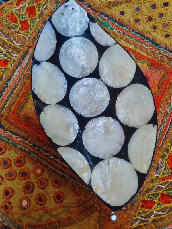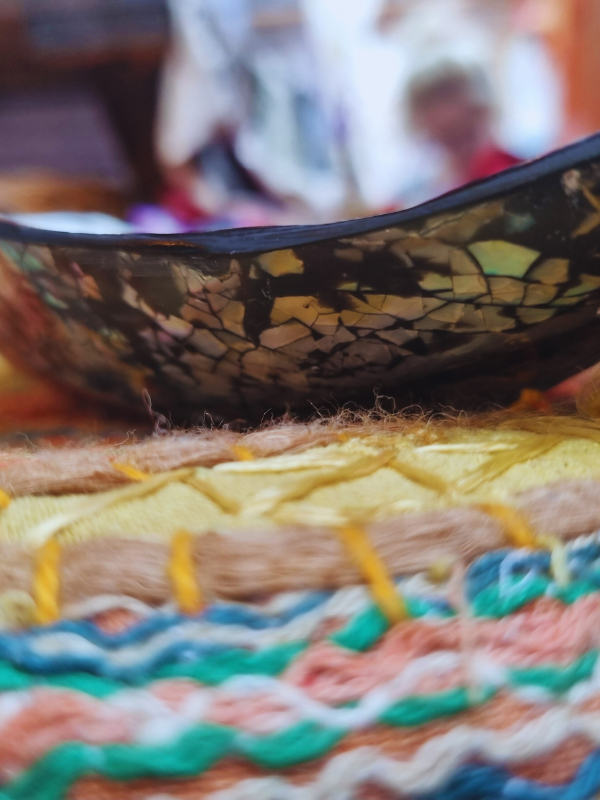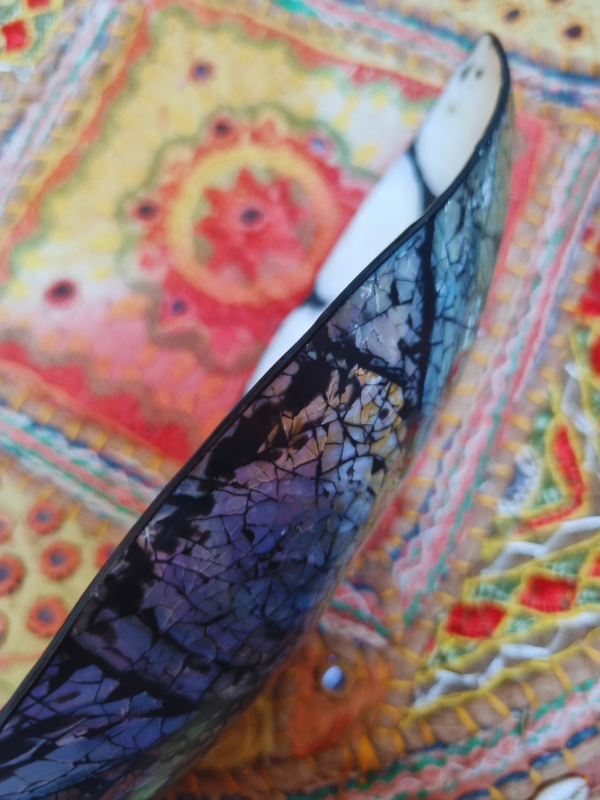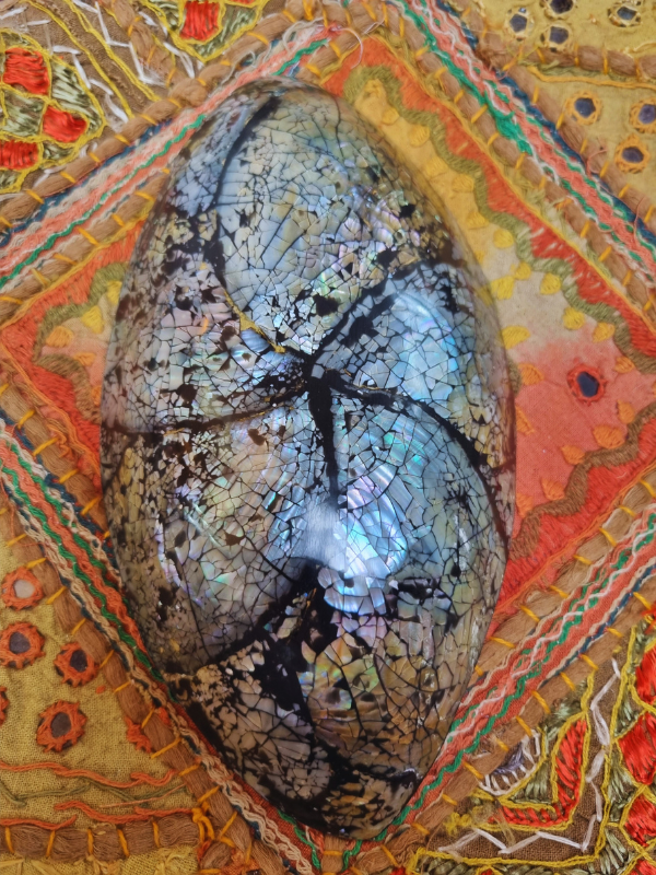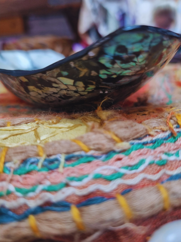 A beautiful trinket dish that's of a larger size than usual(23x12cm). It's made from natural shell and will look gorgeous on your dresser, sideboard or coffee table. The shells are set in dark resin, with rainbow abalone shells pressed into the back. They catch the light in the most beautiful way - setting off the sheen of any jewellery you might put in it.