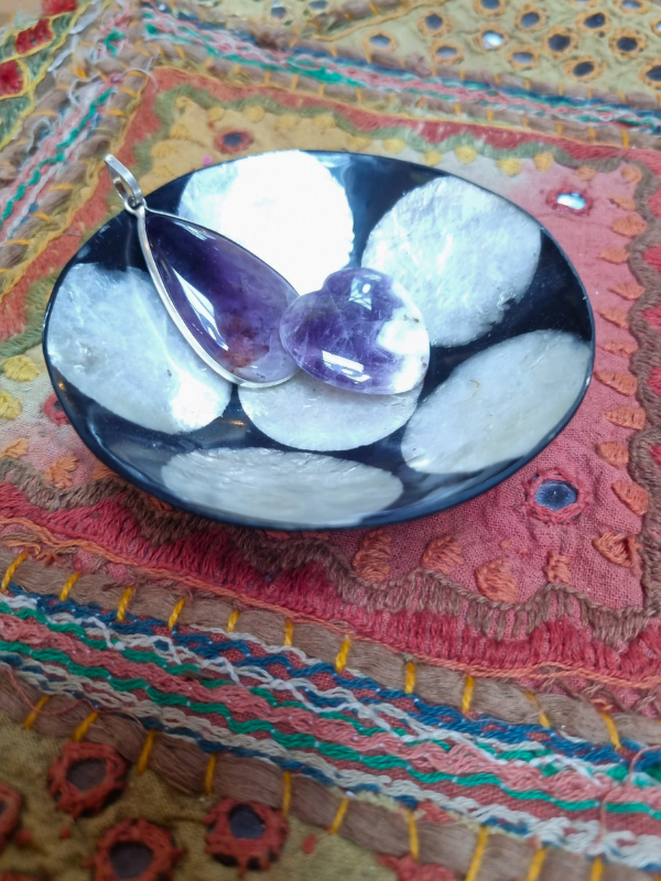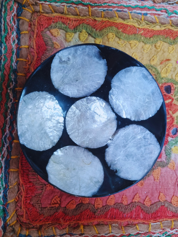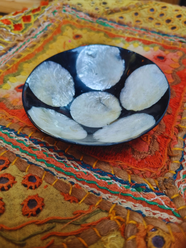 A beautiful little trinket dish with a circular inlay pattern. It's made from natural shell and will look gorgeous on your dresser, sideboard or coffee table. The shells are set in dark resin, with a black resin back. The inlaid shells catch the light in the most beautiful way - setting off the sheen of any jewellery you might put in it.