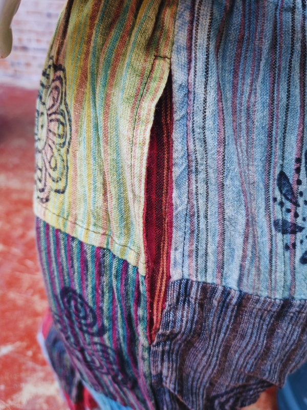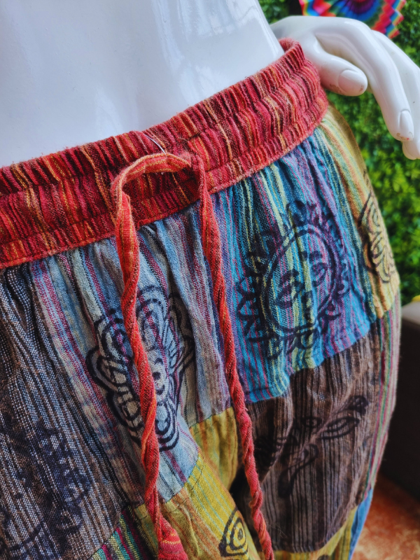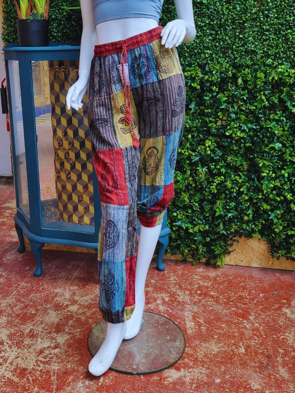 Crafted with a combination of colorful and intricately patterned patches, these trousers are truly one-of-a-kind. Each patch is hand-printed with traditional wood blocks, adding to their unique character and charm. Some patches even feature spiritual symbols, bringing a touch of inspiration to your outfit.